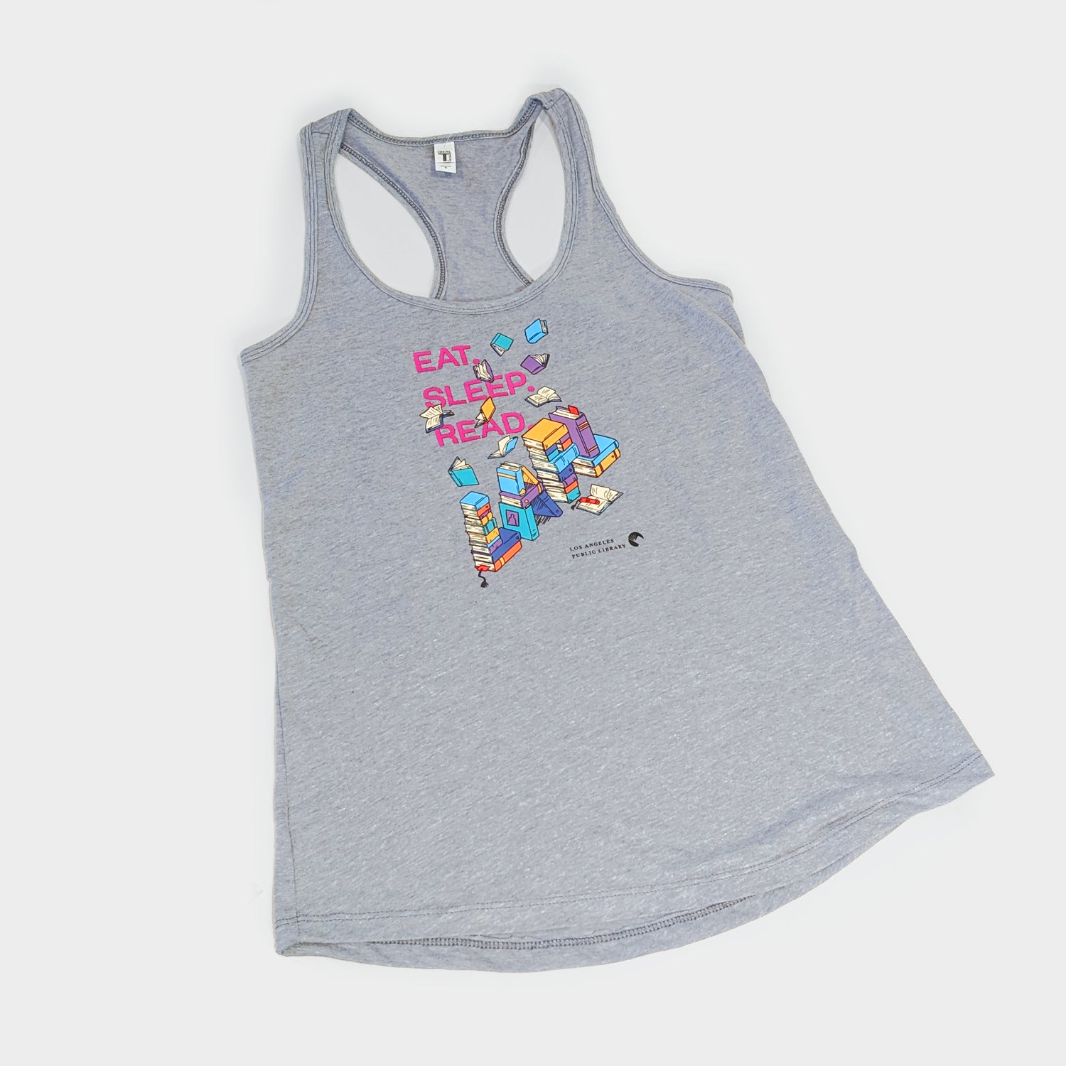 The best things all in one tank top. These racerback, heather-grey style tank tops are perfect for those of you who love the Los Angeles Public Library like we do. With colorful books spelling "LAPL," you'll be sporting your favorite library in style!