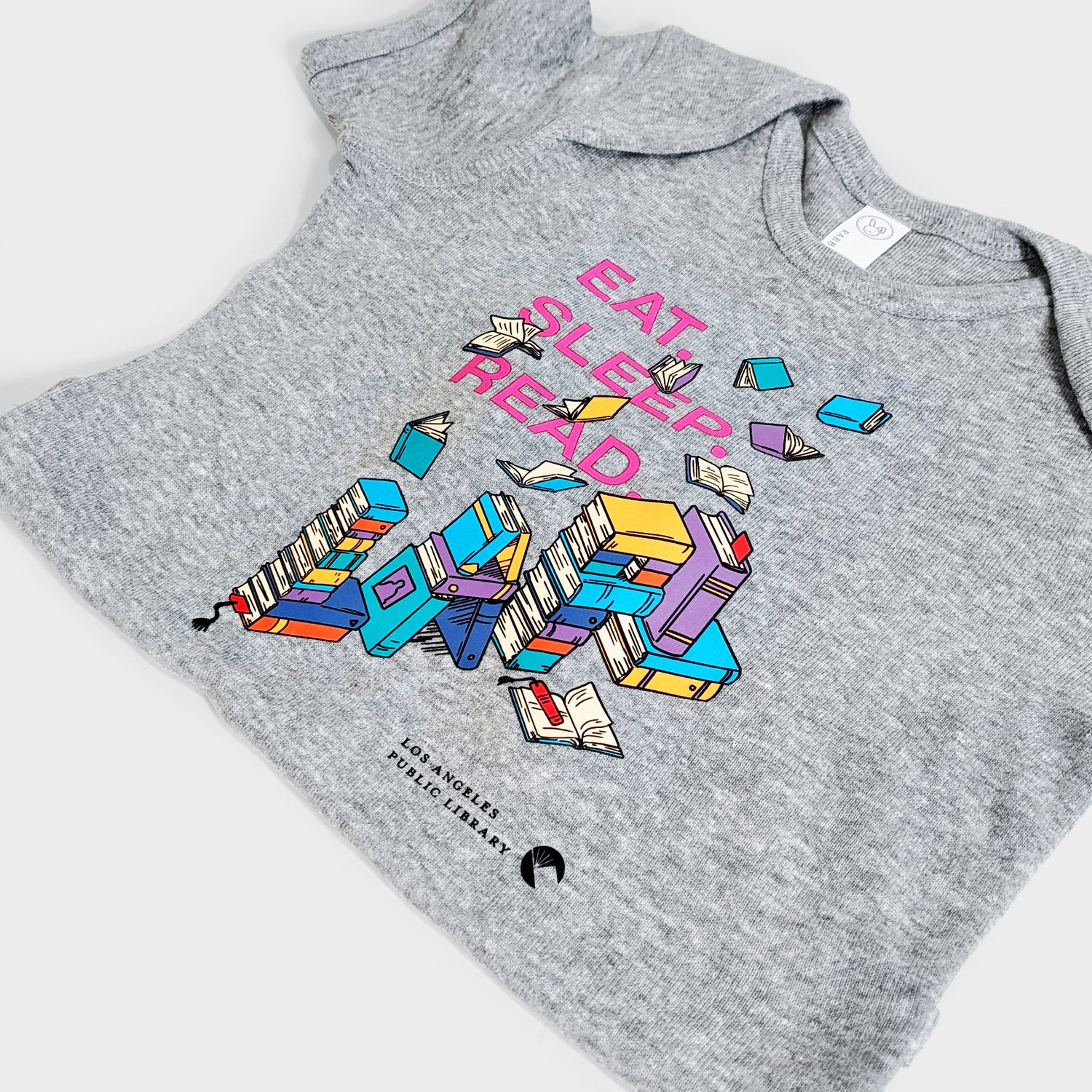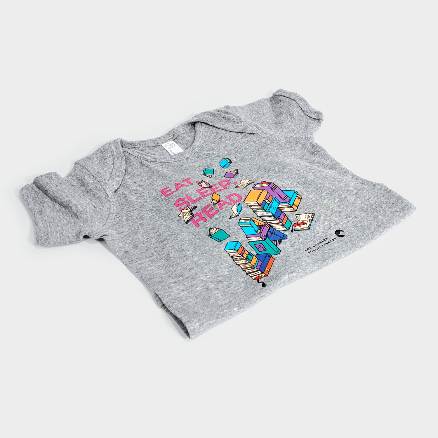"Eat. Sleep. Read." What's better than that? Your baby will be the star of storytime with our exclusive Los Angeles Public Library printed design. A lovely novelty gift for library-loving parents, these heather-grey bodysuits are soft, adorable, and practical for daily use. Made with 90/10, combed ringspun cotton and polyester, these bodysuits feature lap shoulders to make changing simpler, three snap closure, easy-tear labels, and are machine washable.