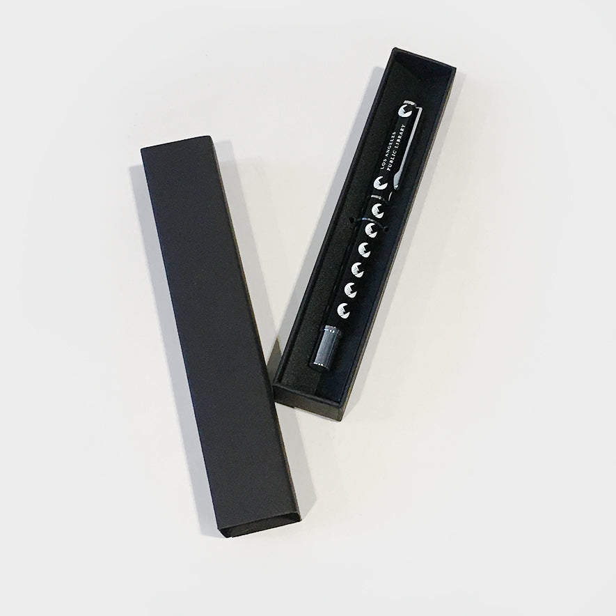 An elegant gift for yourself or any library lover, this sleek metal pen feels good in hand and features a magnetic cap and the LAPL logo in two color patterns: black and white or aqua and orange.