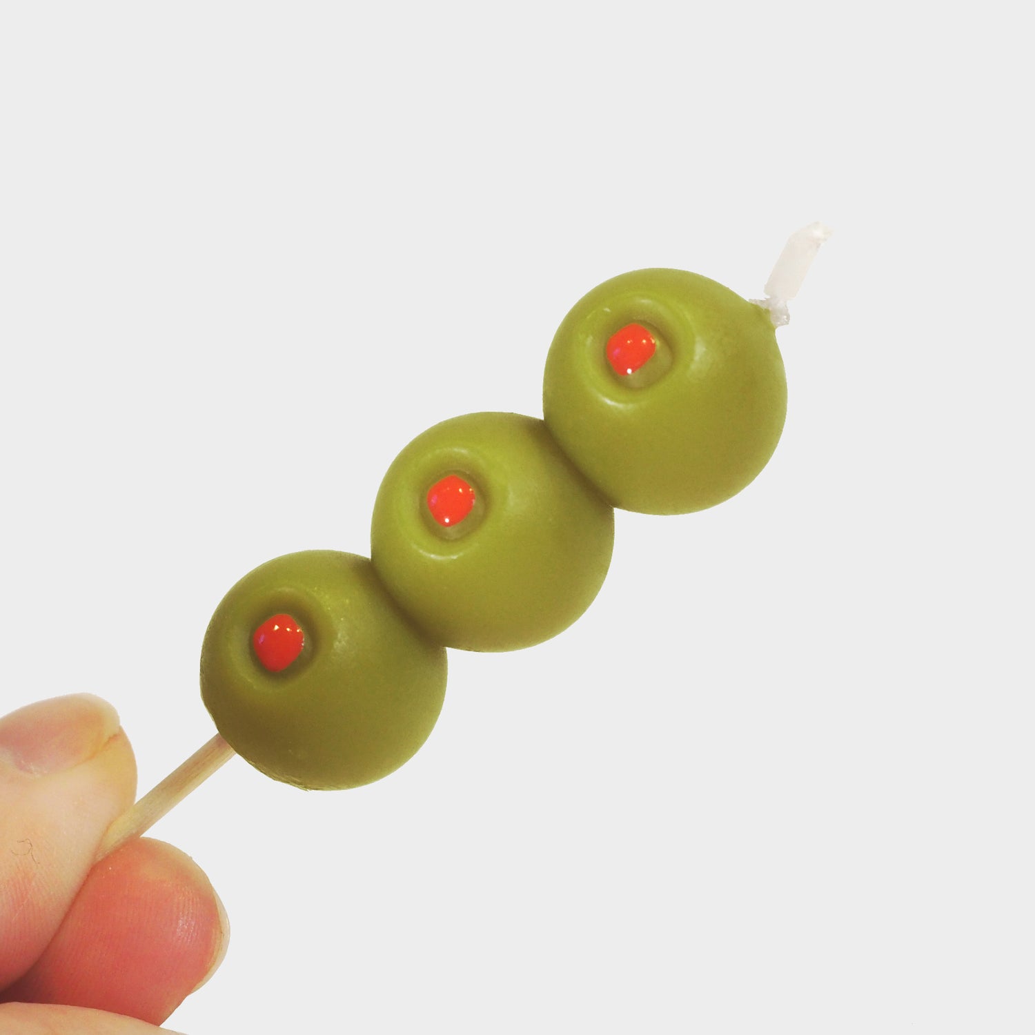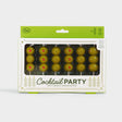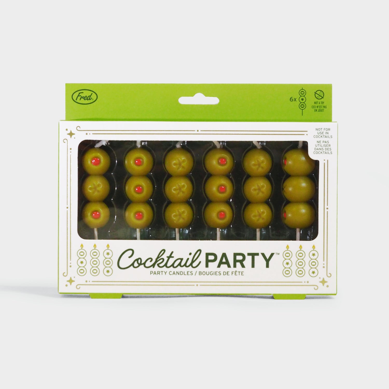 Olive your wishes will come true with Fred’s Cocktail Party candles. These quirky candles are shaped like classic martini olives and mounted on wooden picks—perfect for shaking up any celebration. Each of the six candles stands about 2" tall and comes packed in a festive, gift-ready window box with metallic gold details.