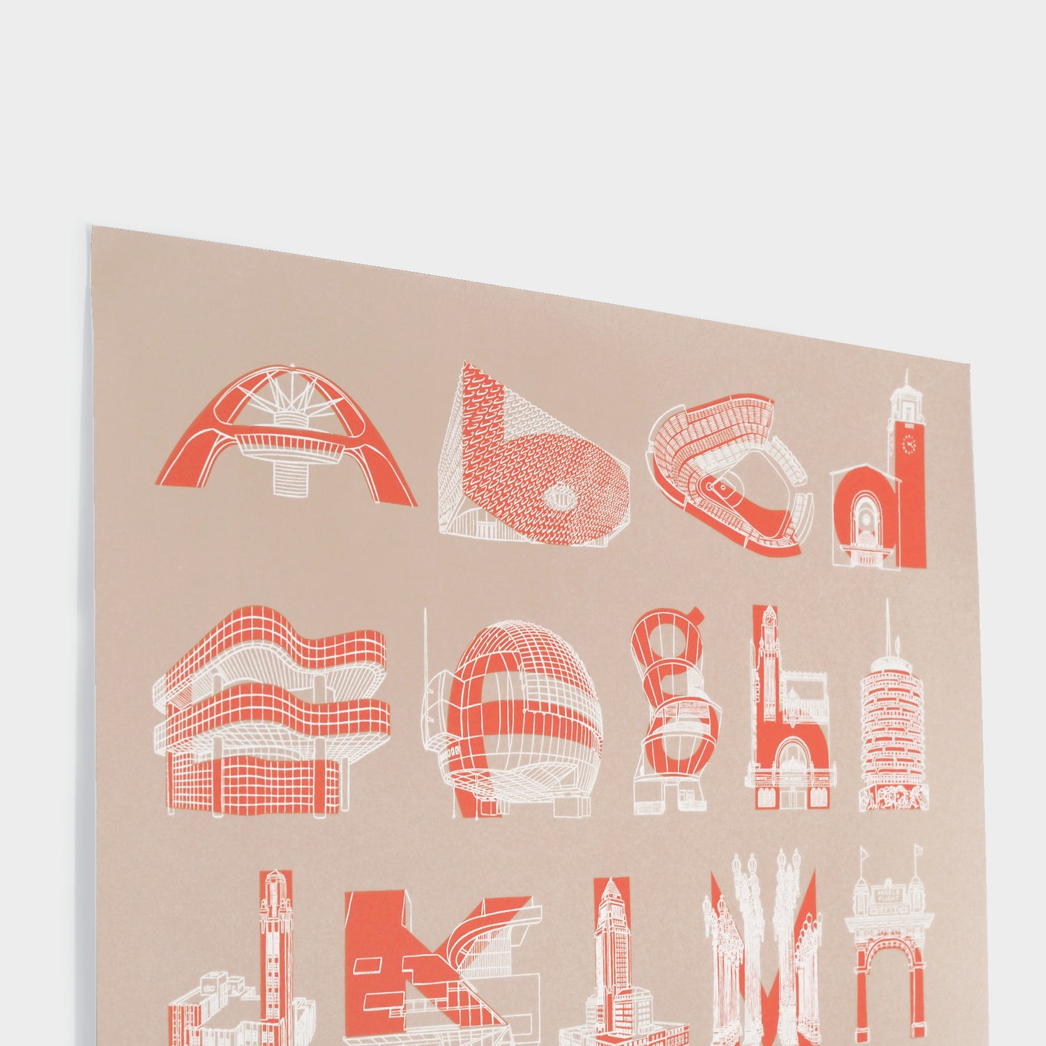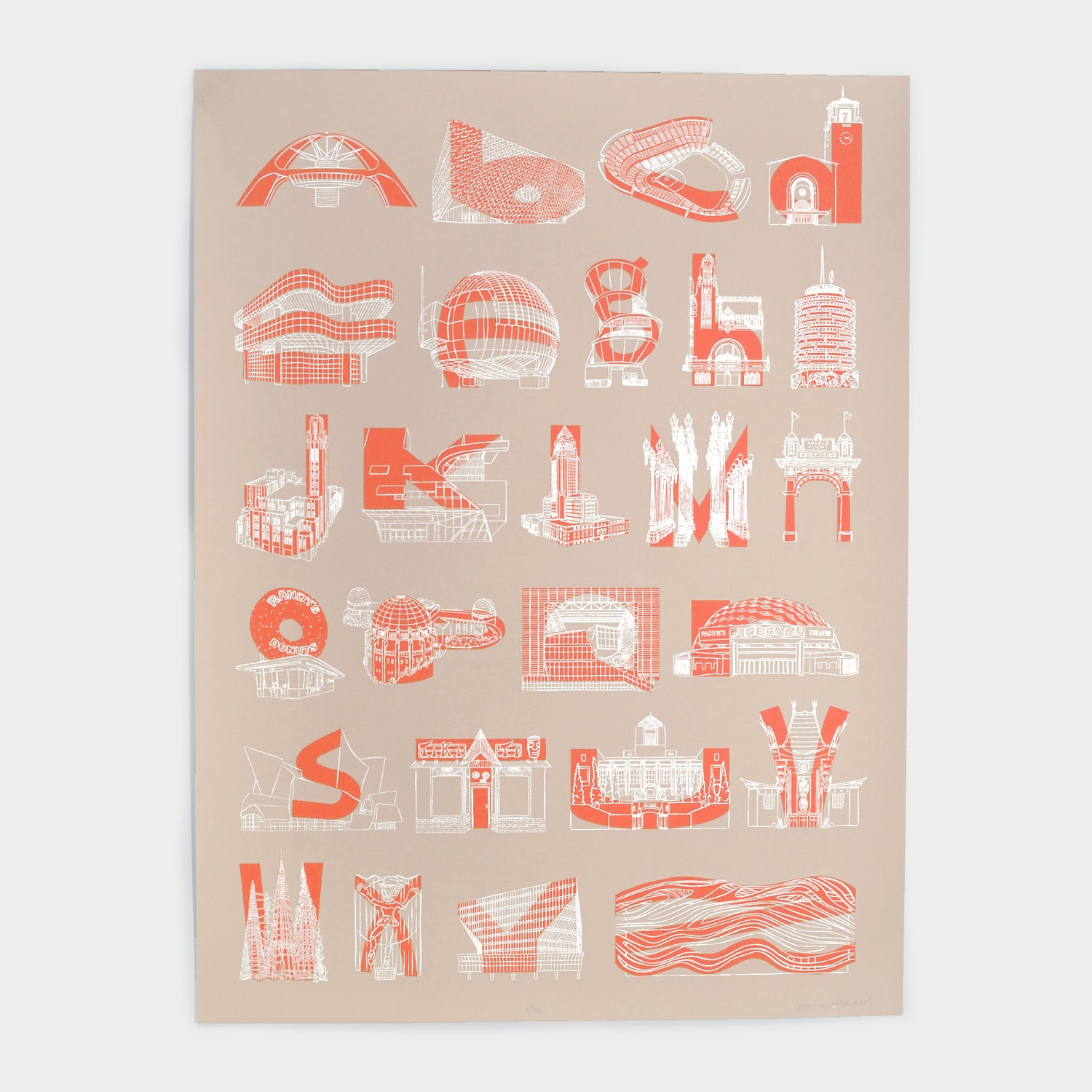 This is a limited edition two color 18" x 24" screen print on 100 lb white cover stock. Colors are light brown and rusty red.
