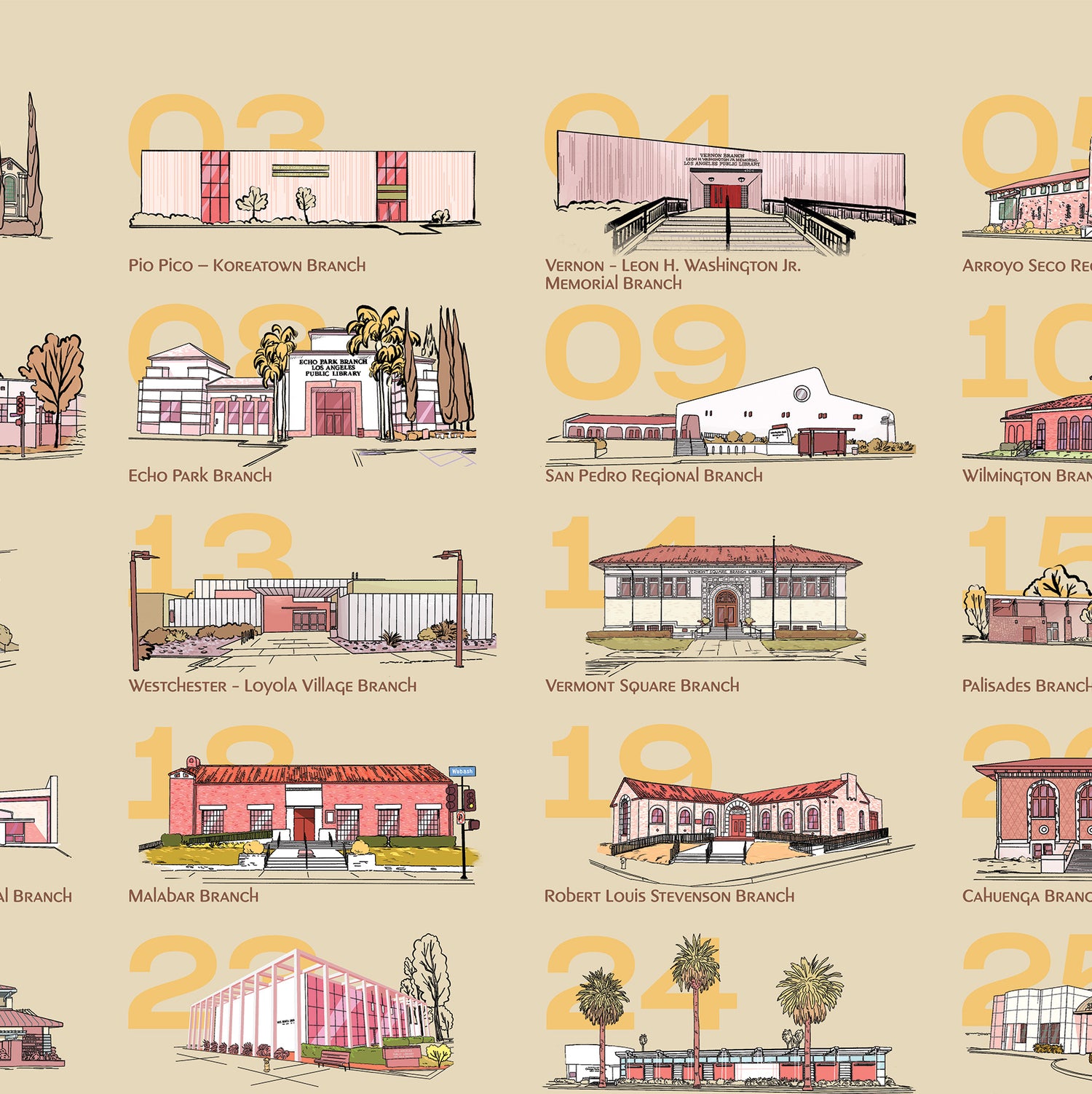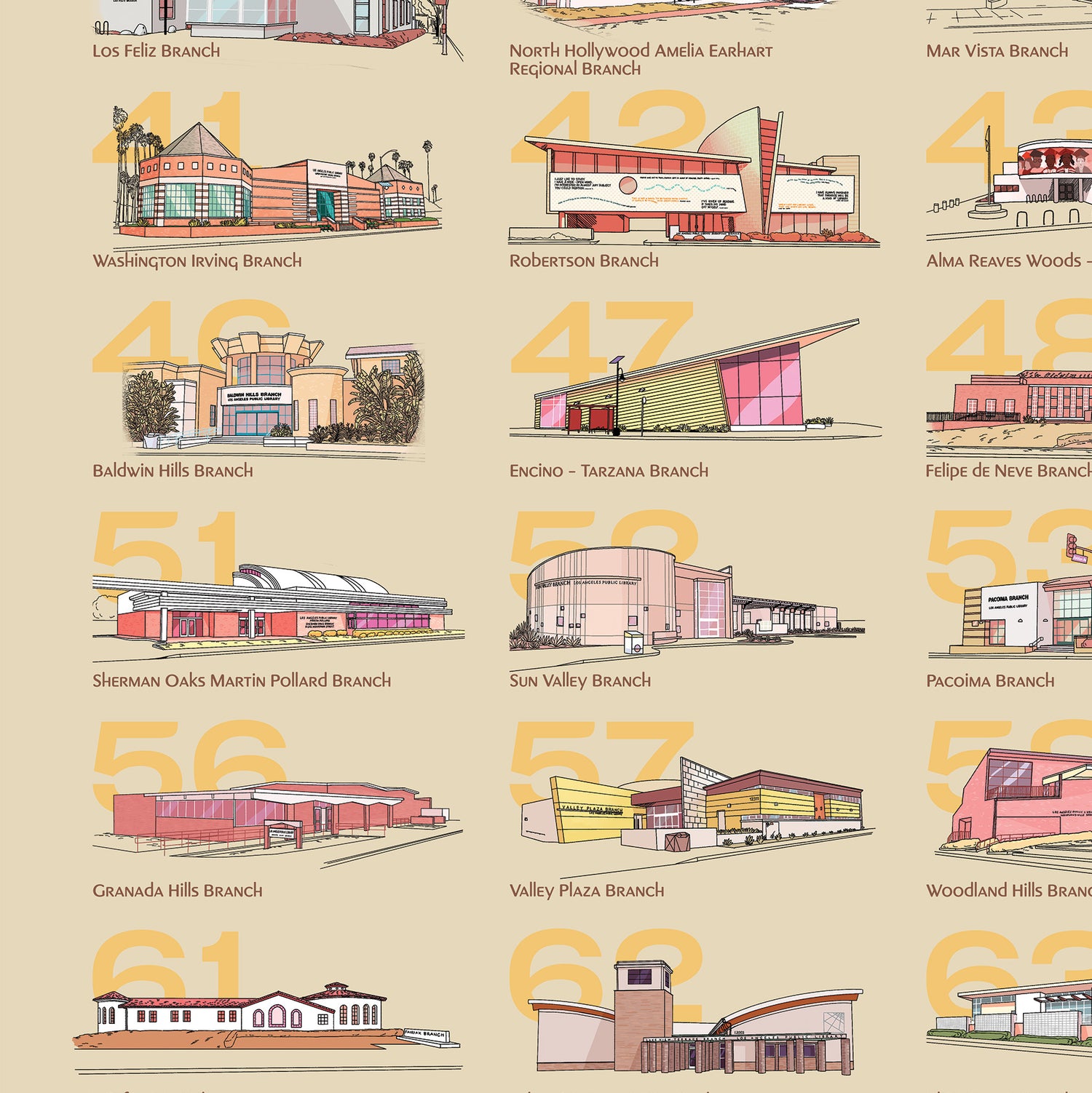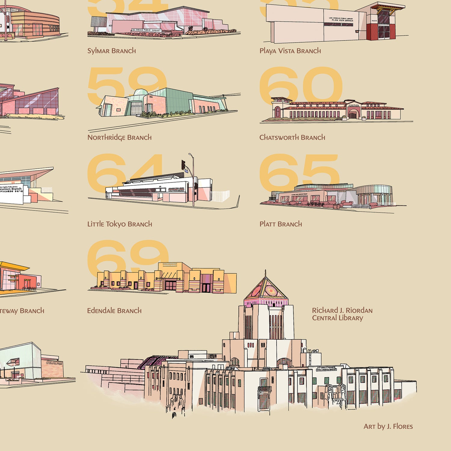 You can enjoy a close look at each with this original print, showcasing artwork of all of LAPL's branches, numbered and labeled based on LAPL's own maps. Artwork by J. Flores.