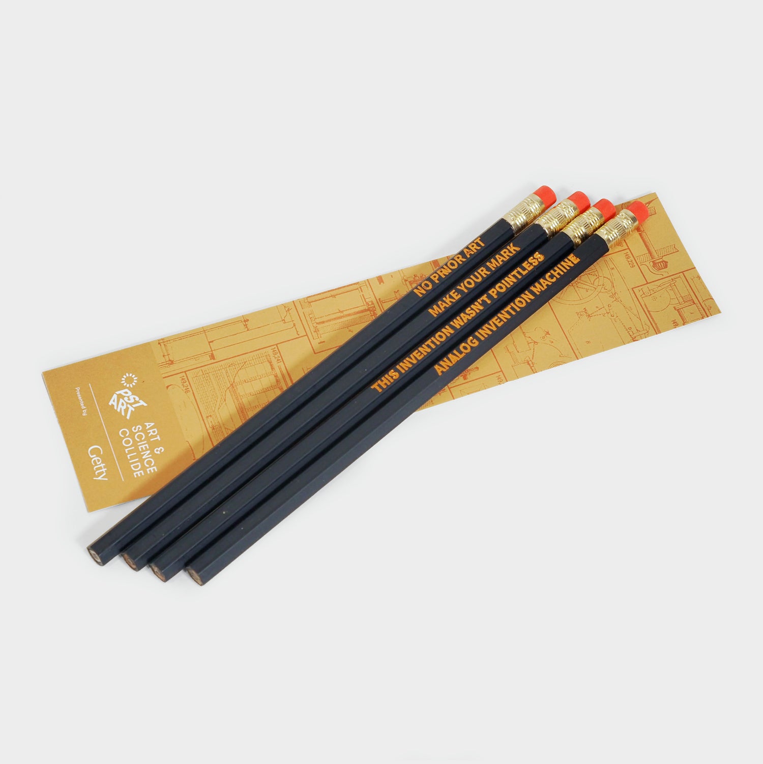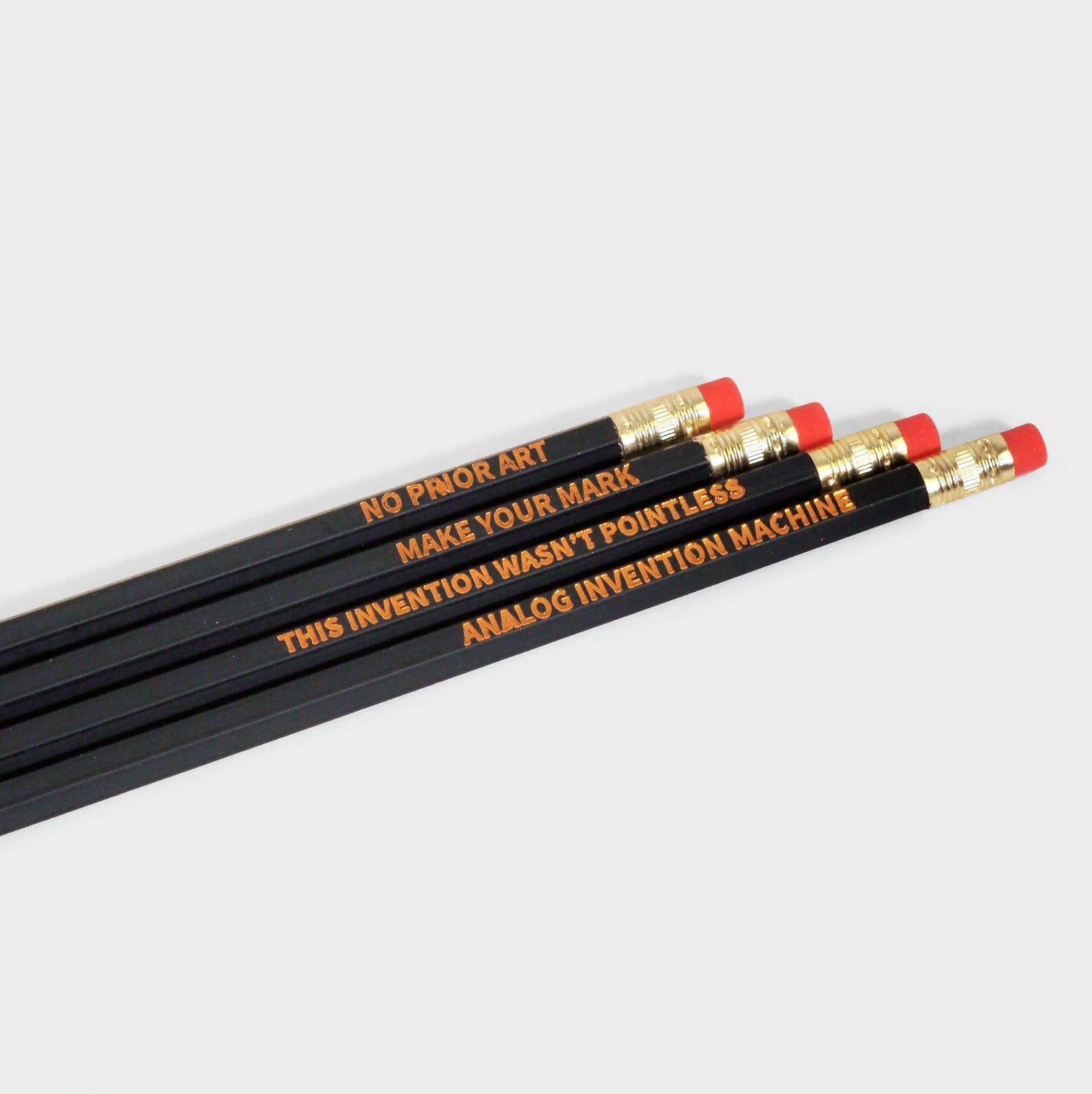 Pencils read, "No Prior Art," "Make Your Mark," "Analog Invention Machine," and "This Invention Wasn't Pointless."