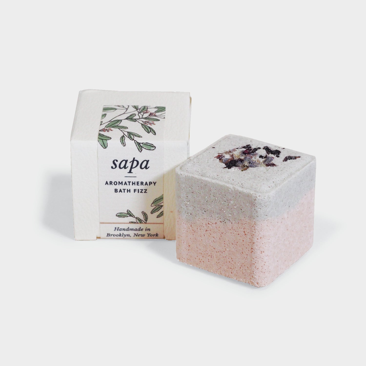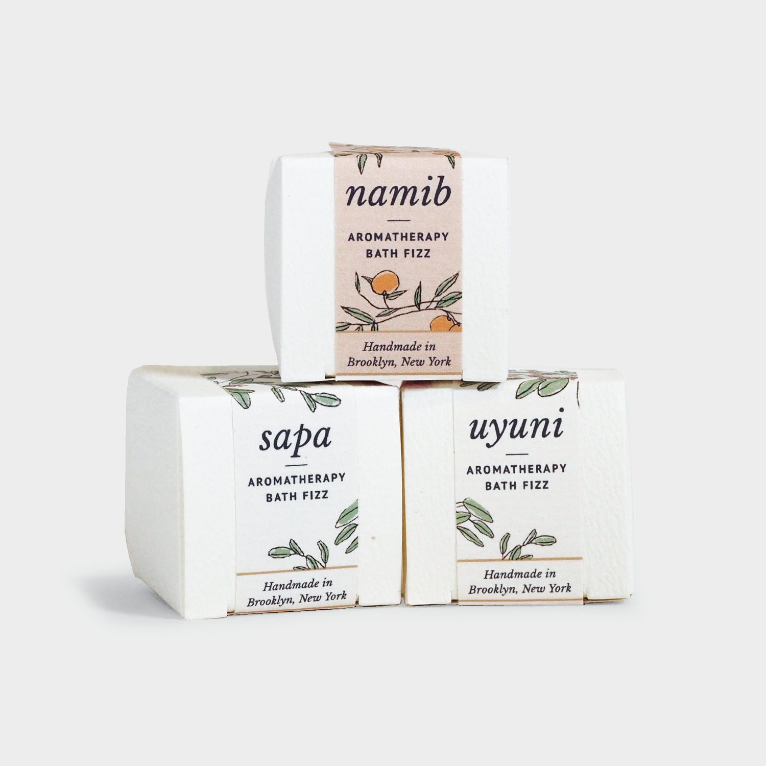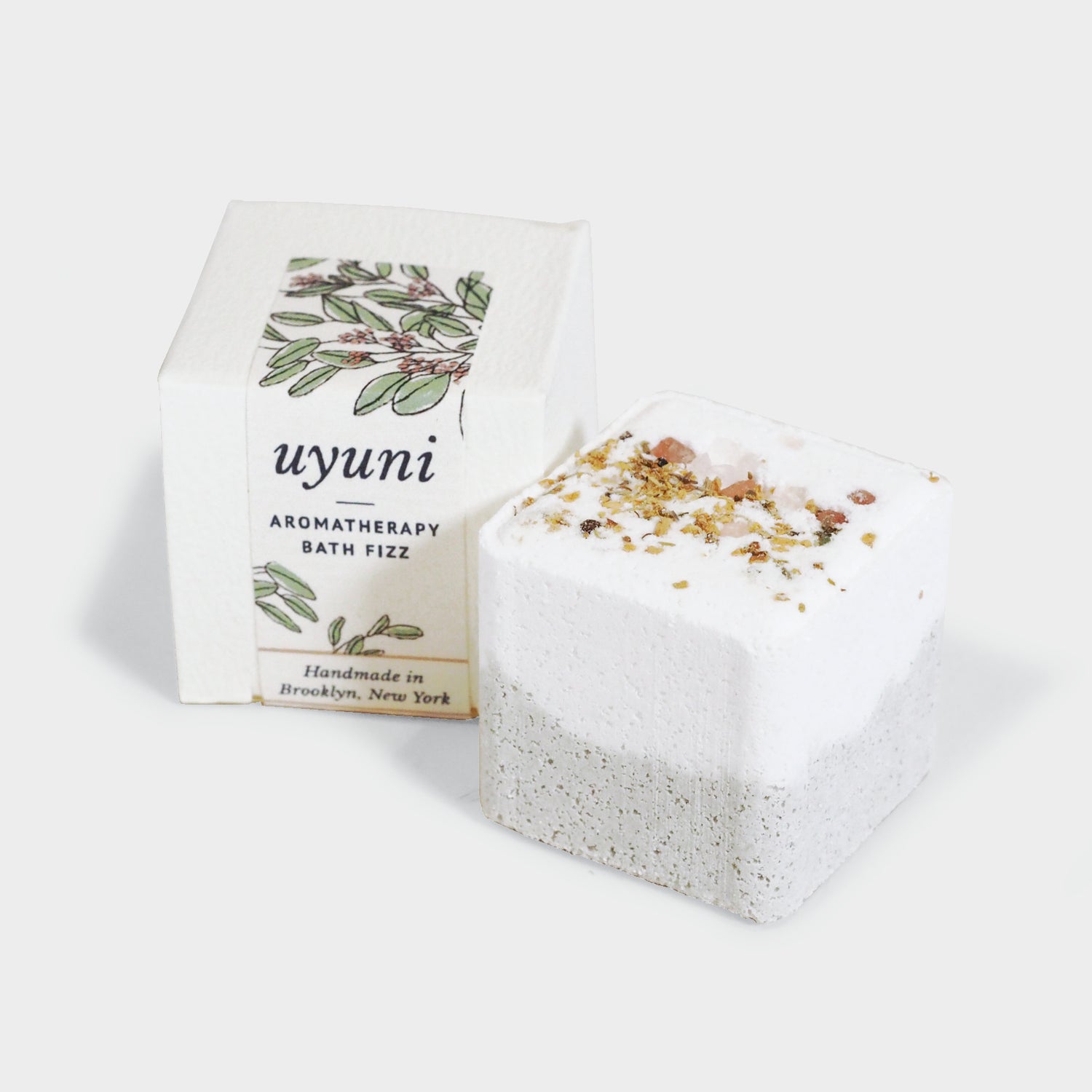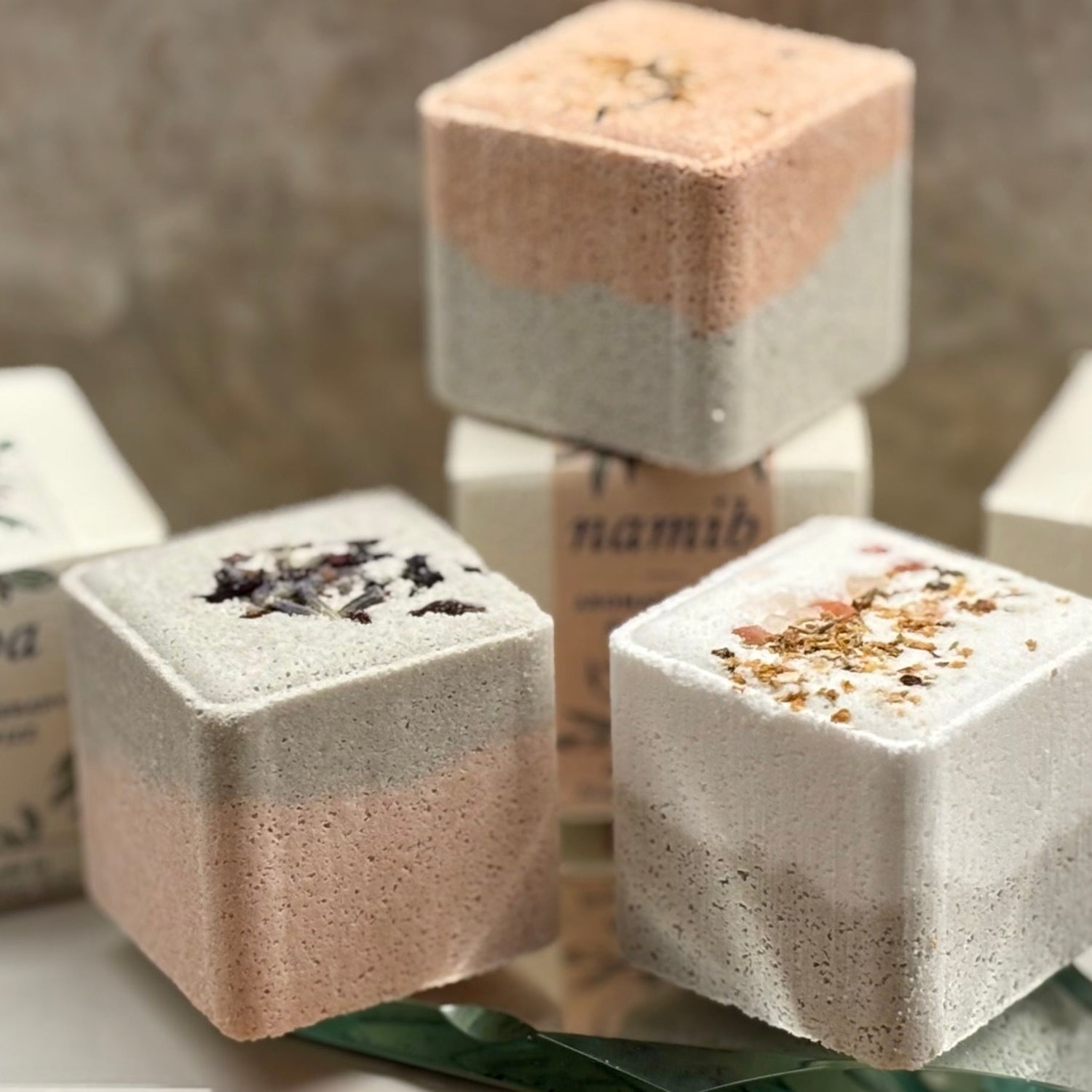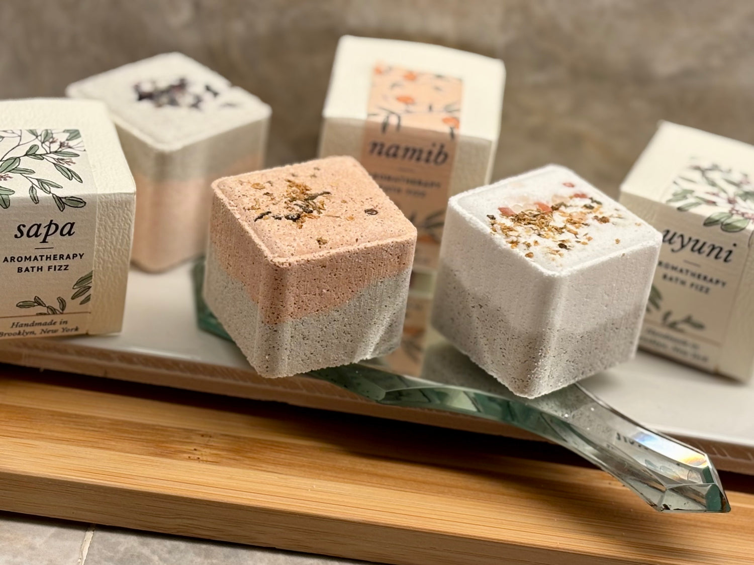 Each fizzy cube is handcrafted using pure clays for color and essential oils for scent — no fillers, no artificial dyes. Infused with shea butter, they soften and nourish as they dissolve. Use one in a bath or set it in your shower to release waves of scent and steam that ease tension from the skin outward.