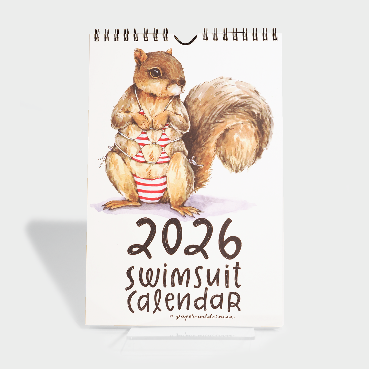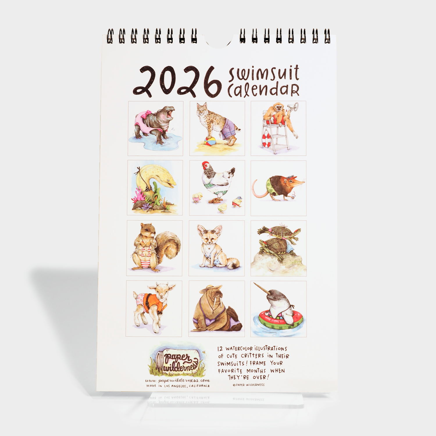 Start the coming year off right with this 2026 Swimsuit Calendar, featuring animals modeling their favorite bikini, trunks, or one-piece! Not your typical sexy swimsuit calendar, you'll be pleasantly surprised by cute moon bears, humpback whales, gerenuks, arctic foxes and more flaunting their swimsuit bods. These happy little critters are ready for the pool and are sure to brighten your day when you see them hanging on your wall!